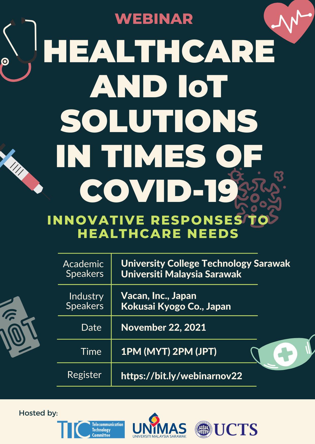 This webinar is hosted as part of a research collaboration between Malaysia (Universiti Malaysia Sarawak (UNIMAS) & University College Technology Sarawak (UCTS) and Japan (The Telecommunication Technology Committee – TTC), which is fully funded by Asia-Pacific Telecommunity (APT). The research investigates patient tracking technology within a public hospital environment, to understand how humans move within medical spaces in the times of the pandemic. IoT and RFID solutions are used to identify and manage patient flow during these critical times.